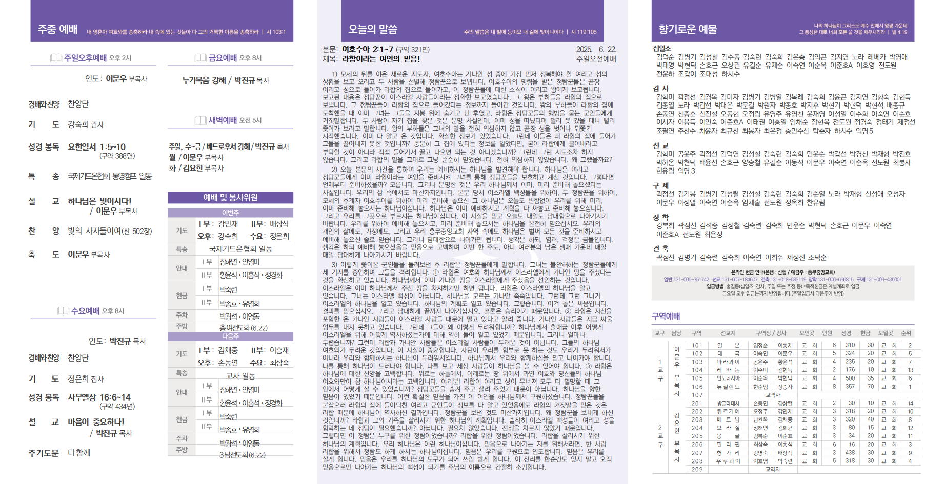 | 578 | 06월 22일 교회소식 | 관리맨 | 2025.06.22 | 122 |