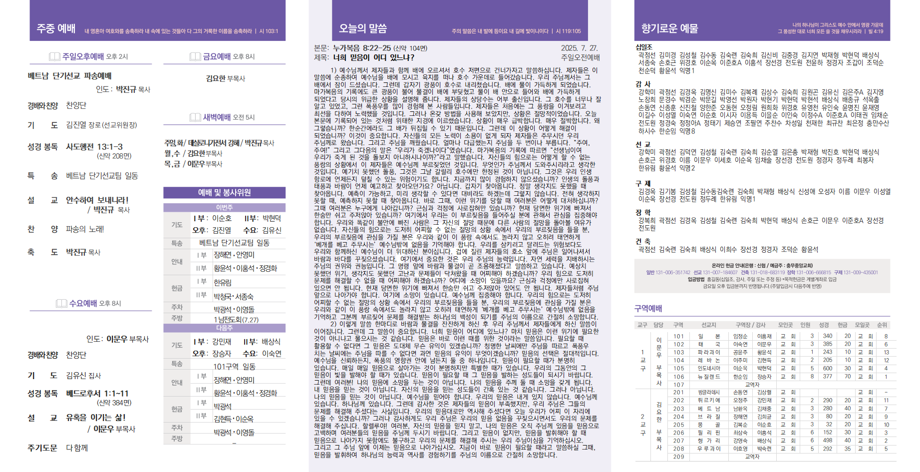 | 582 | 07월 06일 교회소식 | 관리맨 | 2025.07.06 | 118 |