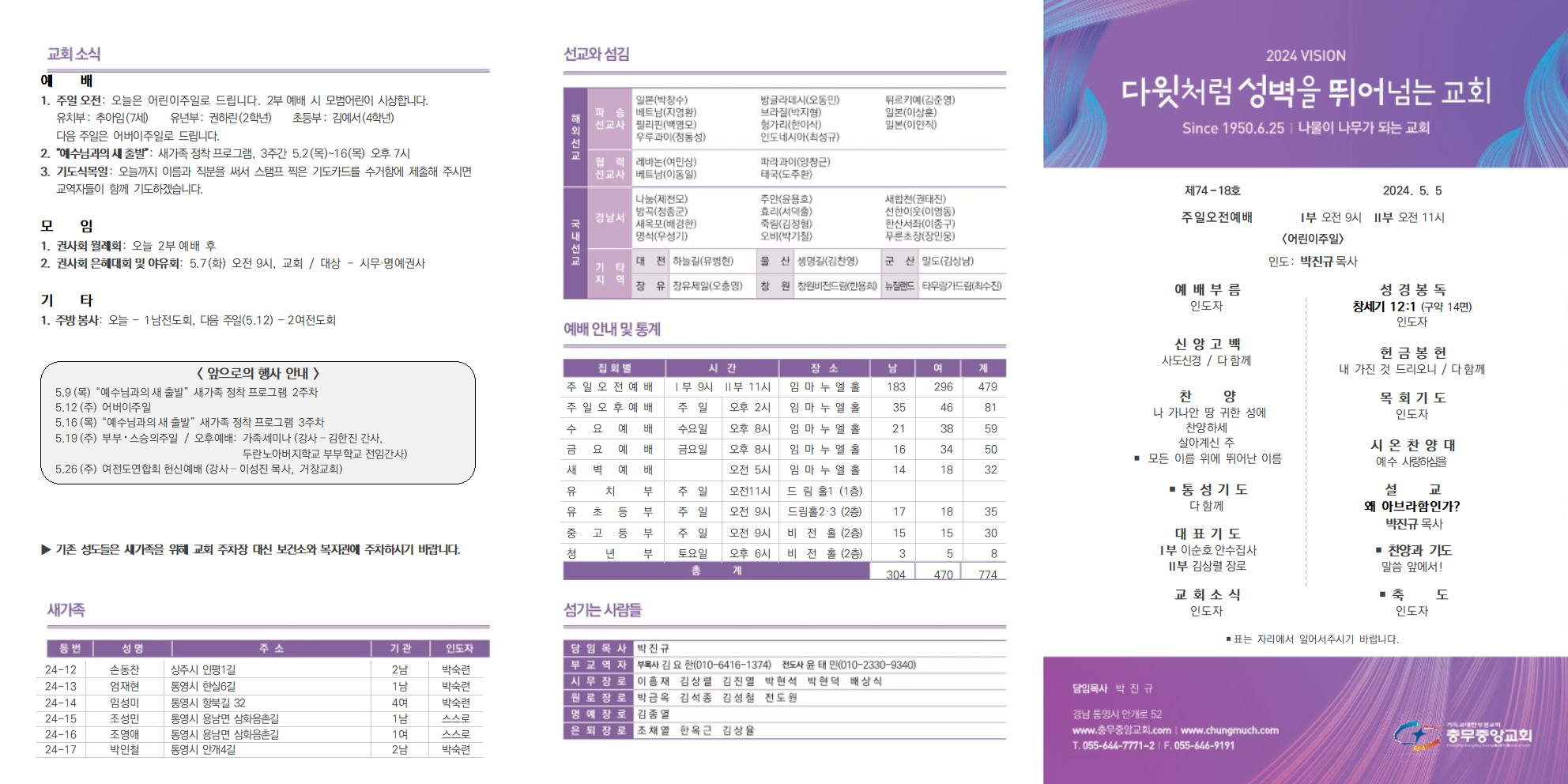 | 458 | 04월 24일 교회소식 | 관리맨 | 2024.04.28 | 465 |