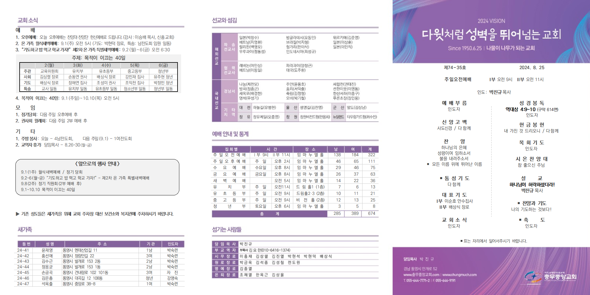 | 496 | 09월 08일 교회소식 | 관리맨 | 2024.09.08 | 286 |